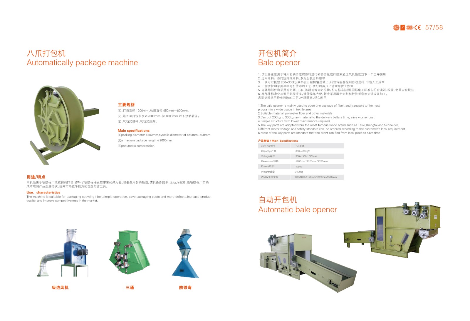 1)機(jī)器功能:將不同規(guī)格的各種捆包纖維按設(shè)定的速度比例輸送給前方機(jī)臺(tái)的 喂棉簾上,可以多